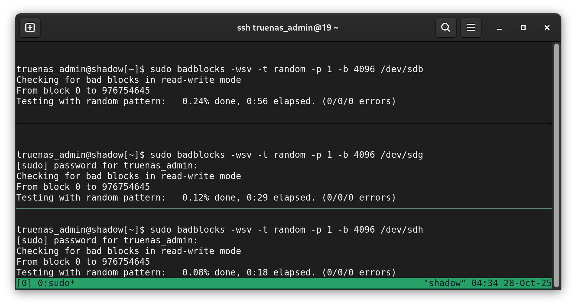 Après avoir lancé badblocks pour tous vos disques durs, vous pouvez laisser la connexion SSH ouverte ou la fermer. Pour vous reconnecter plus tard, reconnectez-vous en SSH à TrueNAS et exécutez tmux attach