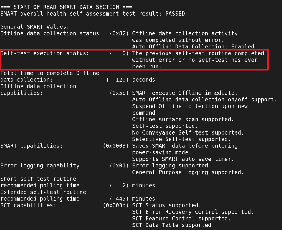 La valeur zéro (0) signifie que notre test est terminé ou qu'aucun test n'est en cours d'exécution. Vous pouvez toujours interrompre un test avec smartctl -X /dev/sdX