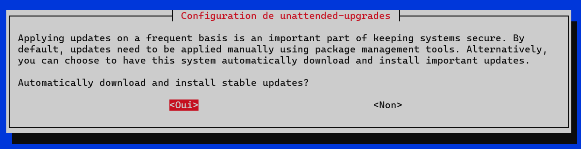Activez les mises à jour automatiques à l'aide de la commande suivante, qui vous demandera si vous souhaitez activer les mises à jour automatiques. Sélectionnez Oui et appuyez sur Entrée, ce qui confirmera que le service unattended-upgrades est actif et prêt à gérer les mises à jour pour vous.