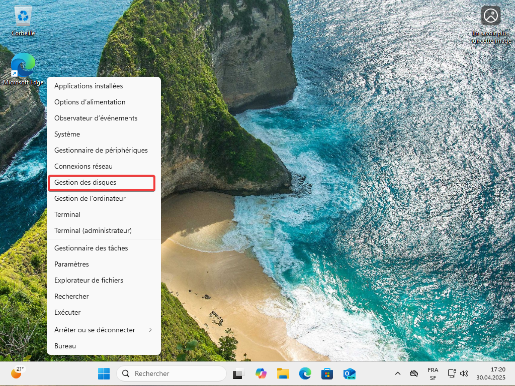 Effectuez un clic droit sur le logo Windows dans la barre des tâches et sélectionnez Gestion des disques :