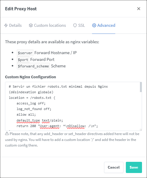 Ce guide présente les en-têtes de sécurité recommandés pour renforcer la protection de votre site web hébergé sur Nginx Proxy Manager. L'implémentation de ces en-têtes aide à prévenir diverses attaques, notamment les attaques XSS, le sniffing de type MIME et d'autres menaces liées à la sécurité.